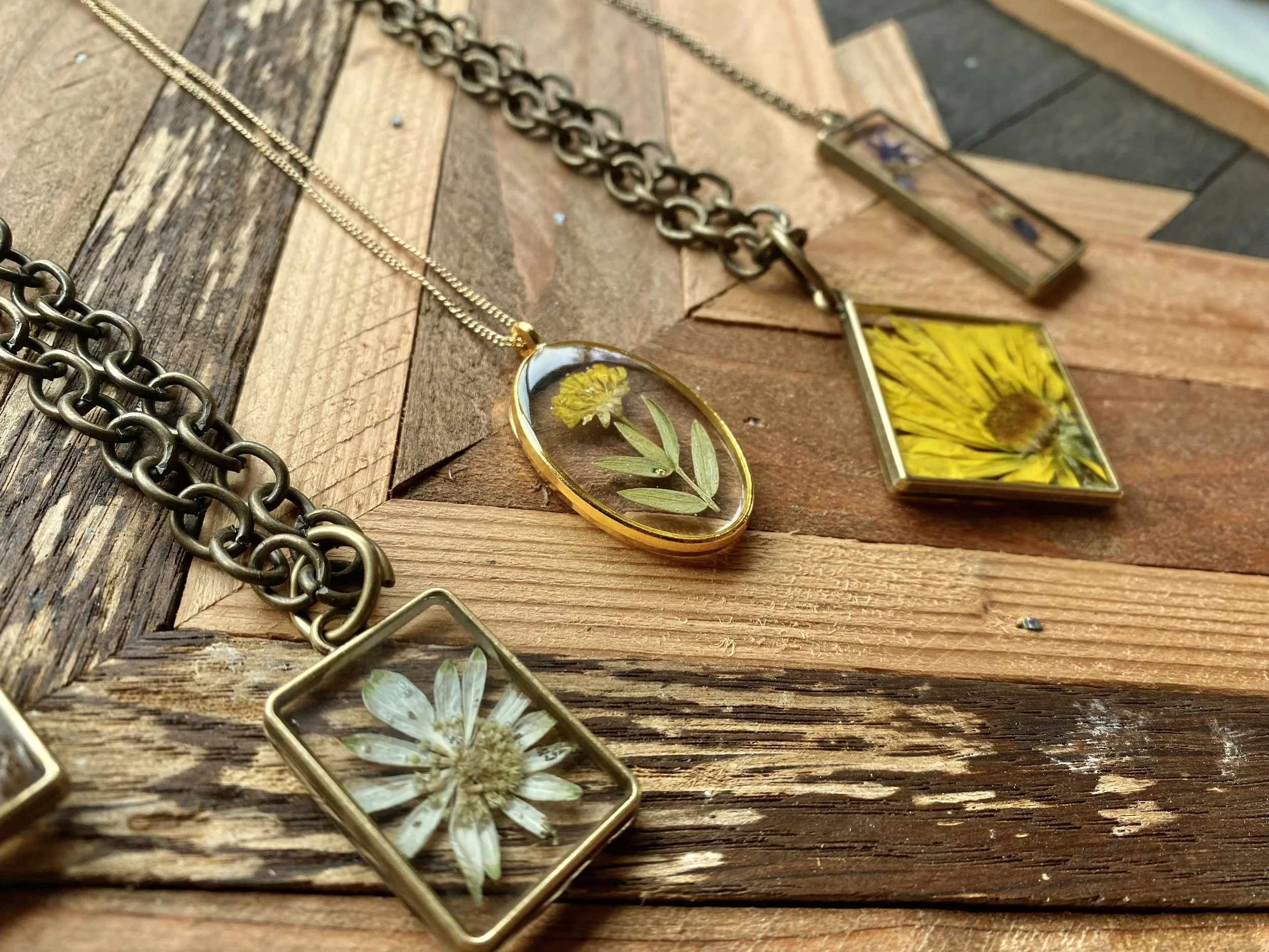 The flowers from your bouquet will be preserved through a meticulous drying and pressing process, then encased in epoxy resin to create a beautiful pendant. Available in gold, silver, and bronze finishes, with a variety of pendant shapes and the option to purchase a matching chain.